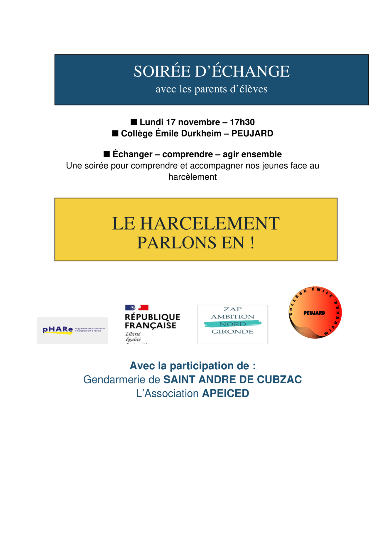 🚨Soirée d’échange avec les parents. Lundi 17 novembre 17h30. Le harcèlement parlons en !🚨
