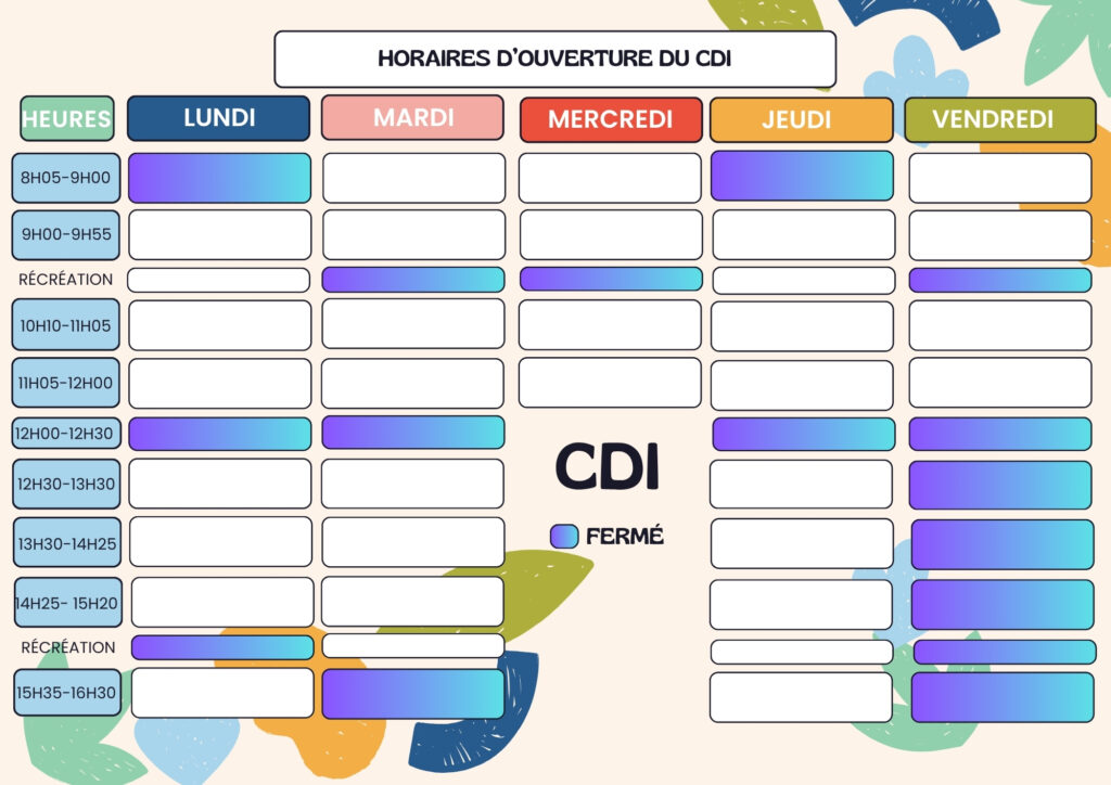 Les élèves peuvent venir au CDI sur les plages horaires indiquées en dehors des heures de cours.